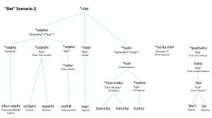 In Nahuan languages there are two basic types of words for "bat". Some are derived from the PSUA root *sopi(tsi), and others are coined as a compound of words for "mouse" (kimichin) with words meaning either "to fly" or "butterfly". Interestingly the words, derived from the PSUA root are also in most cases compounds with the root *na:ka, which appears related to the Corachol word for "mouse" naika (which also appears in the proto-Tepiman root for "bat" *naakamɨri). The compounds of "mouse" + "fly/butterfly" seem a likely calque, as this compound is also found in Ópatan sikur sopits "bat" (lit. "mouse-butterfly").