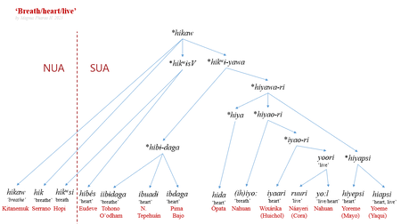 For example, Stubbs (2011#302) gives *hikʷis "breath, spirit, heart". Voeglin, Voeglin & Hale (1962:140) give *hikʷɨ(sɨ) "to breathe" from cognates in Tohono O'odham (ʔíibhɨ), Hopi (híkʷsɨ) and Raramuri (iwí). In Nahuan we see that both the word for "breath" and for "heart" as well as for "to live" are derived from the proto-Corachol-Nahua root *hiyaori, attesting to the cultural and semantic association between these words, also later on in the development of the SUA languages. ʷ This suggests that these roots participate in a semantic complex of words related generally to "life force", "soul", "animating principle". It seems this force has been located at different times and among different groups in the breath or in the heart. Also words for "blood" and "liver" participate in this complex, though they seem to be more related to "thought" and "emotions".